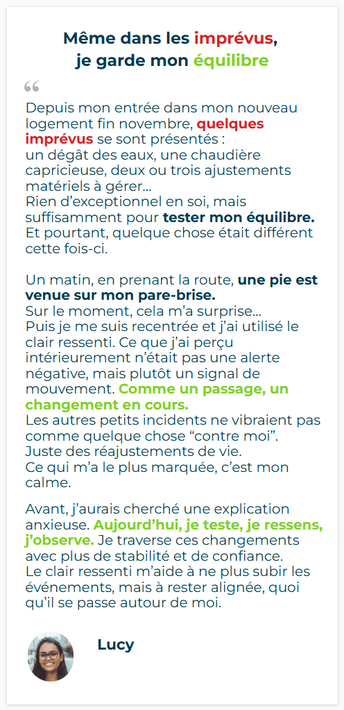 Câest cette rĂ©gularitĂ©, cette Ă©coute sincĂšre, qui a ouvert mes perceptions. Petit Ă petit, mon corps est devenu un vĂ©ritable guide : frissons, picotements, tensions, Ă©lans du cĆur⊠Tout a commencĂ© Ă parler. Et jâai compris que le clair ressenti nâest pas un don rĂ©servĂ© Ă quelques Ă©lus, mais une capacitĂ© naturelle que nous avons tous â Ă rĂ©veiller, Ă affiner, Ă honorer.